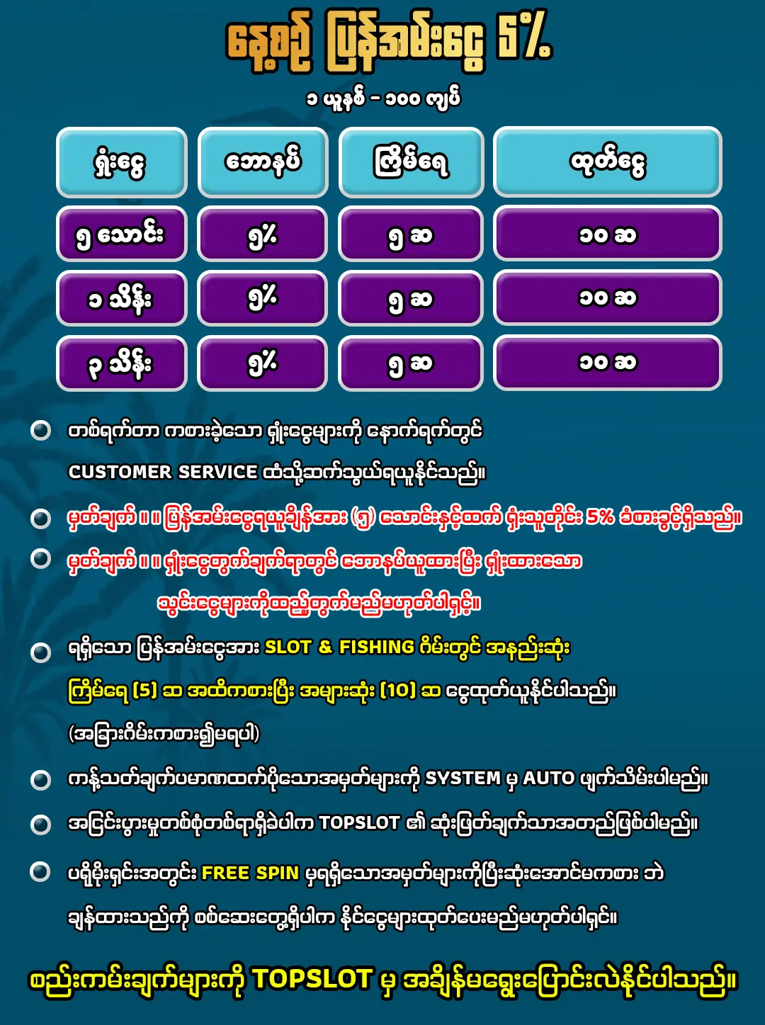 4. Once per person, per account, address, email, phone number, bank account, bank account name, IP used in the registration if verified and have duplicate information, or in case of abuse or multi-accounting, TOPSLOT.com has the right to cancel the promotion balance without notice to know in advance